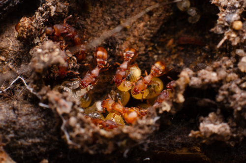 El único nido conocido se encontró en esclerófilos abiertos bajo rocas en el suelo en la ladera de la cresta, y en nidos de Polyrhachis ammon y Pseudoneoponera mayri.