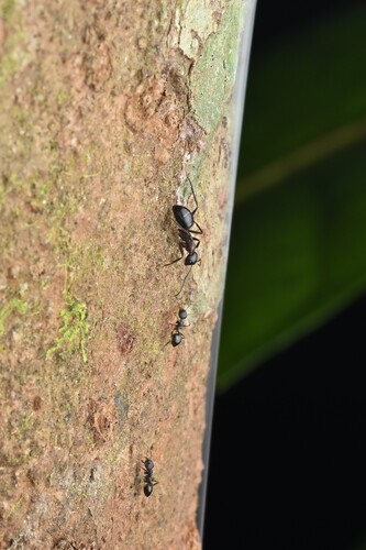 Esta especie comparte nido con Camponotus rufifemur en las selvas tropicales del sudeste asiático.
